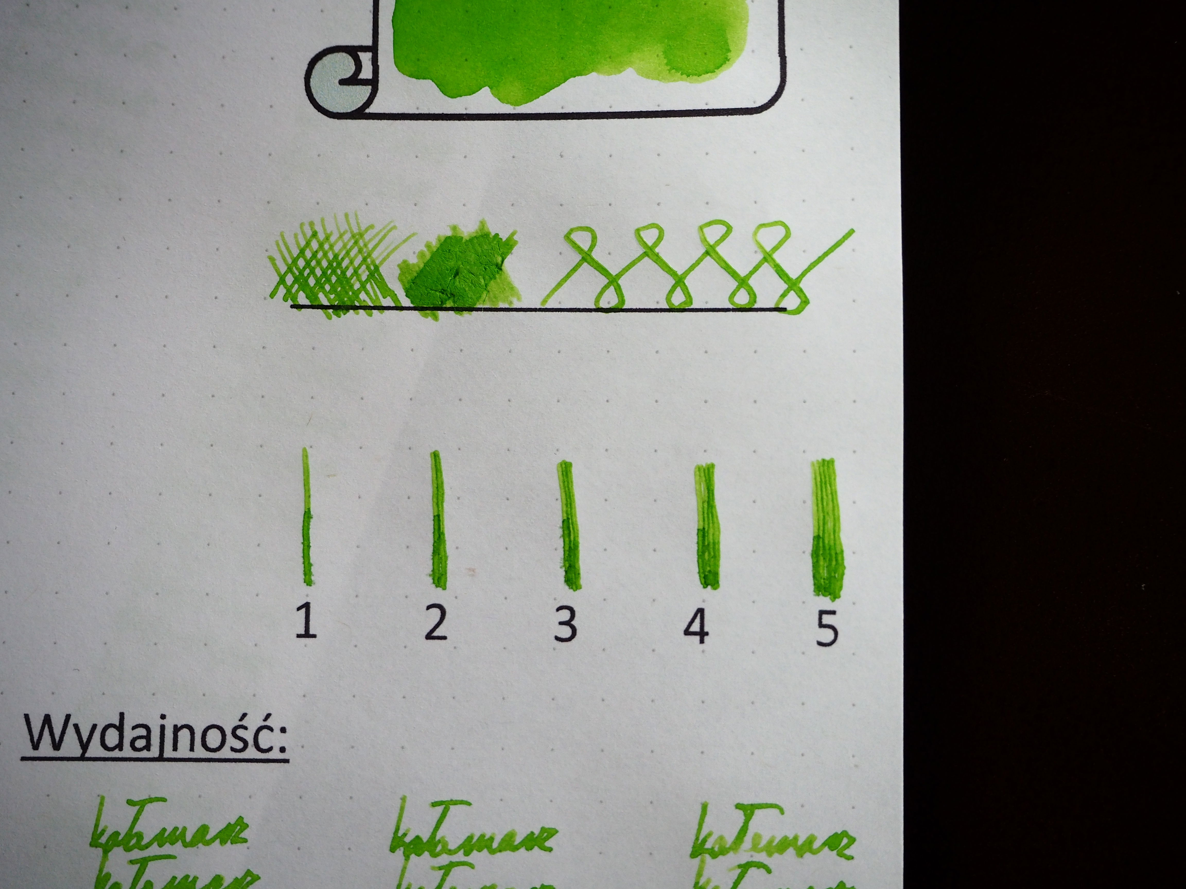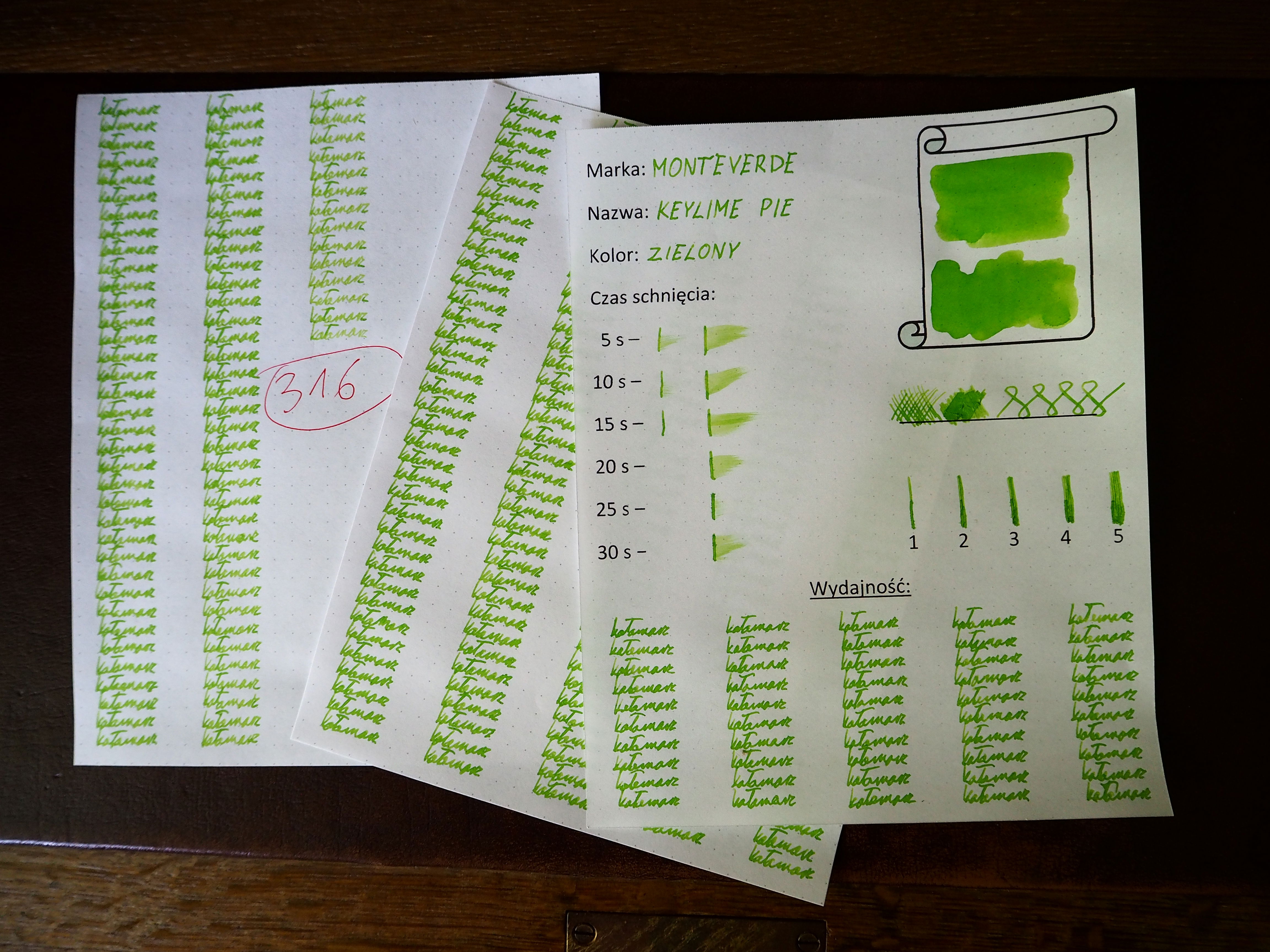 Przepływ atramentu Keylime Pie oceniam jako dostateczny (jak dla mnie jest zbyt wodnisty). Atrament zawarty jedynie w sekcji pióra wystarczył na napisanie 316 "kałamarzy". Za to otrzymuje 0,25 punktu. Co ważne, przy sprawnym pisaniu nie stwierdziłem efektu strzępienia.