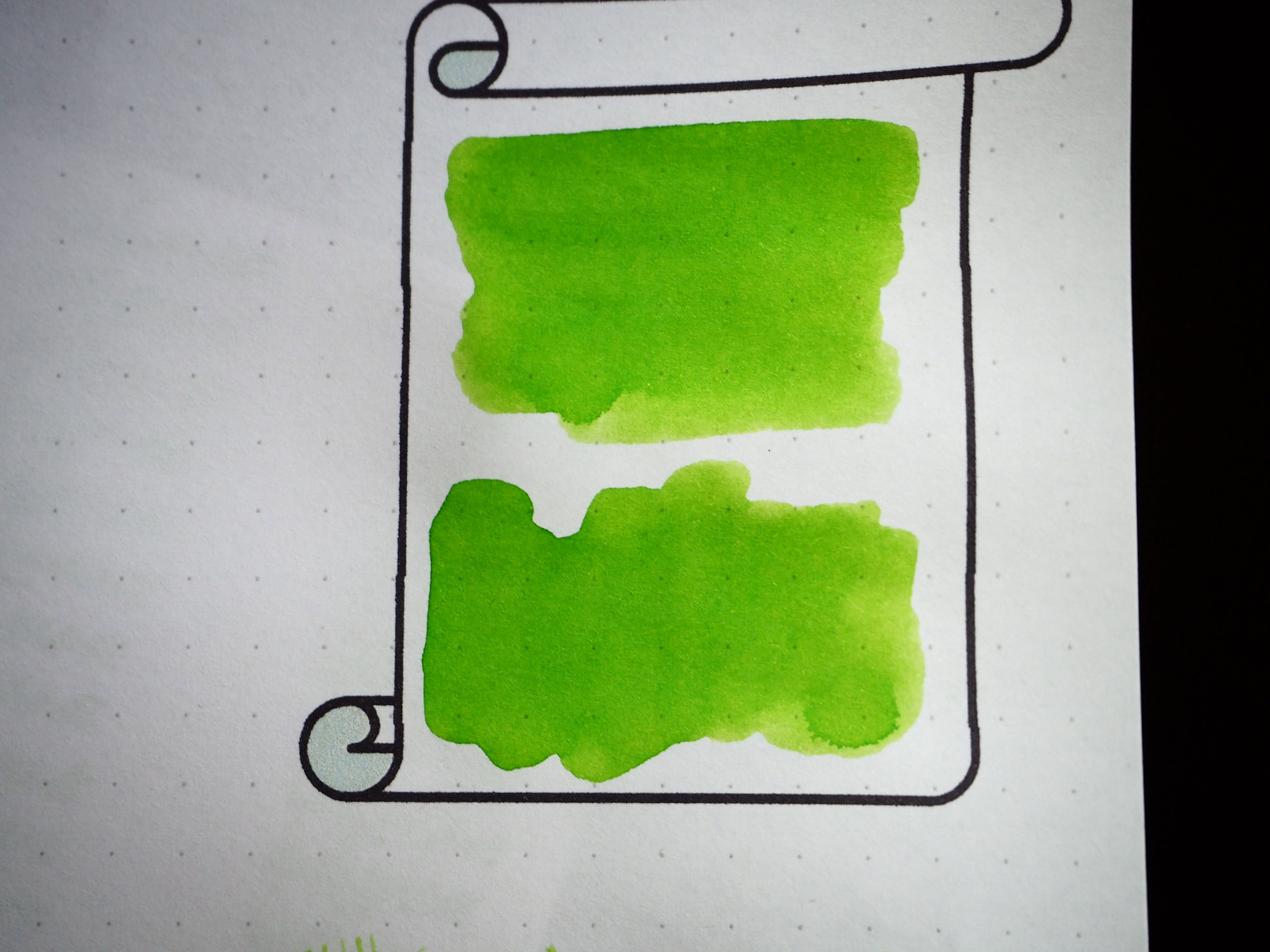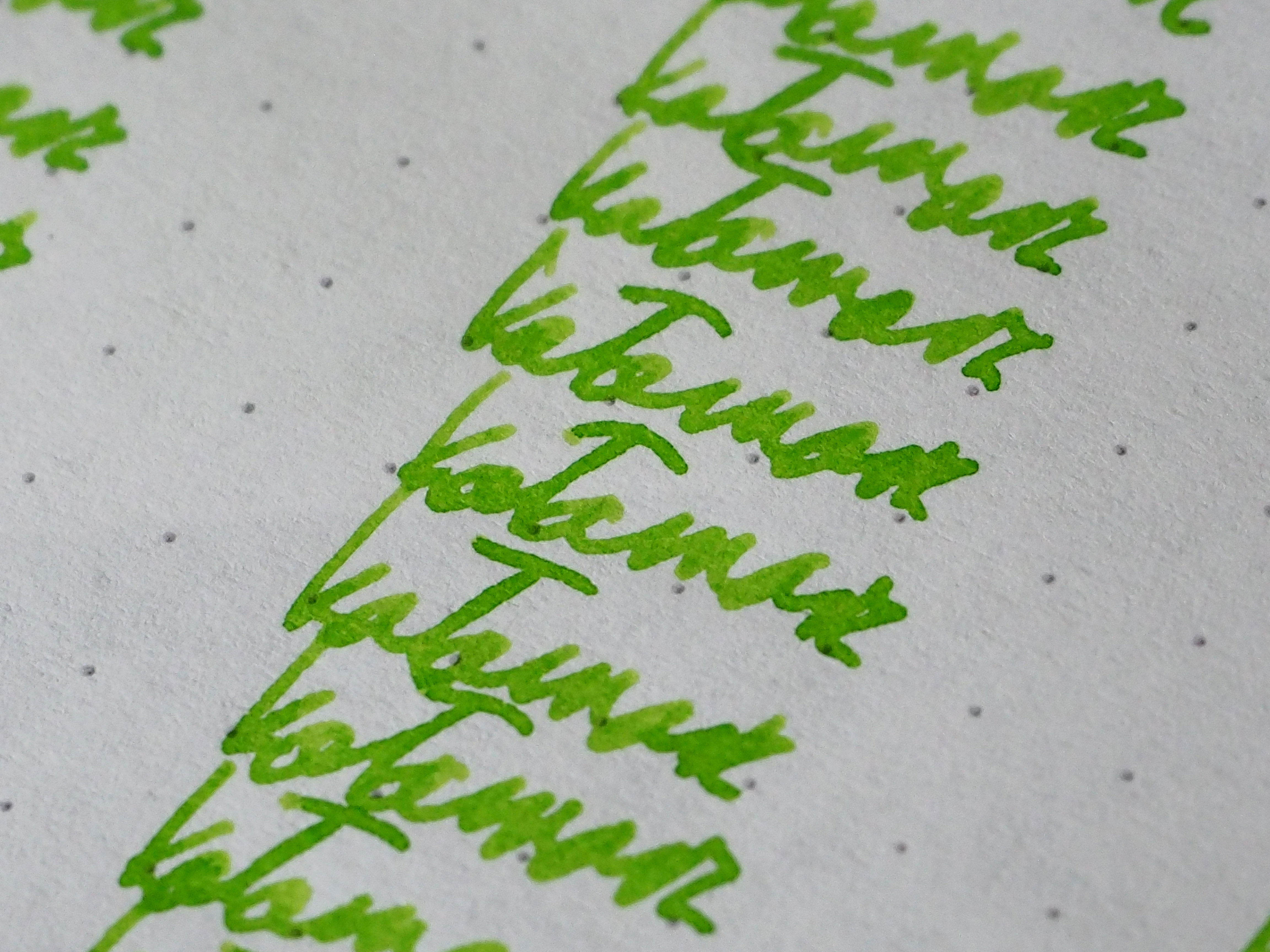 Kolor Keylime Pie nawiązuje do amerykańskiego placka z limonkami. Czy jest adekwatny? Prawdopodobnie tak. Czy mi się podoba? Niekoniecznie. Posiada delikatną tendencję do cieniowania, posiada jakąś głębię, ale uważam, że do pisania jest zbyt mało wyrazisty. Na dłuższą metę męczy wzrok. W słabym świetle ciężko się go używa, a w mocnym słońcu rozprasza światło i też słabo się z nim pracuje.