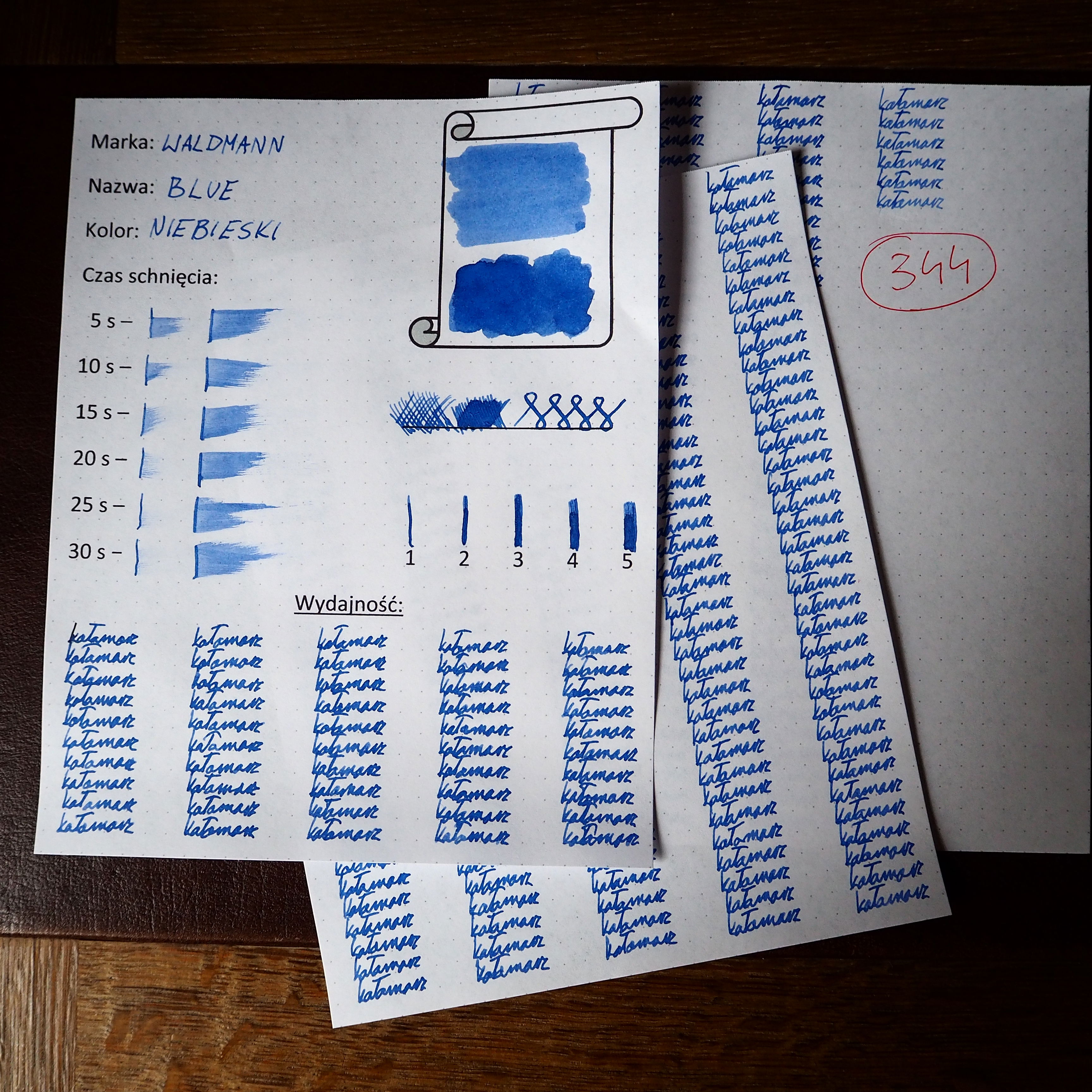 Muszę przyznać, że mam mieszane uczucia w stosunku do tego atramentu. Z jednej strony jego właściwości nie powalają, ale z drugiej strony... No właśnie. Muszę cofnąć się nieco do recenzji czarnego atramentu Waldmanna, gdzie wysnułem podejrzenie, że marka ta korzysta z zewnętrznej produkcji. Przypuszczałem tak na podstawie marnych właściwości czarnego atramentu, który uchodzi za ekskluzywny (jak cała marka Waldmann). Teraz, kiedy przeprowadziłem testy koloru niebieskiego i jego właściwości pokrywają się niemal identycznie z kolorem czarnym, jestem szczerze zaskoczony. Nigdy nie widziałem aby dwa różne atramenty tej samej marki posiadały tak zbliżone właściwości. Punktacja mówi sama za siebie. Odszczekuję moje wcześniejsze słowa i stwierdzam, na podstawie obu testów, że Waldmann produkuje atramenty sam i wychodzi mu to cholernie dobrze. Oba kolory traktowane oddzielnie nie robią wrażenia, jednak po zestawieniu ich razem widać, że jest to solidna produkcja zasługująca na uznanie.