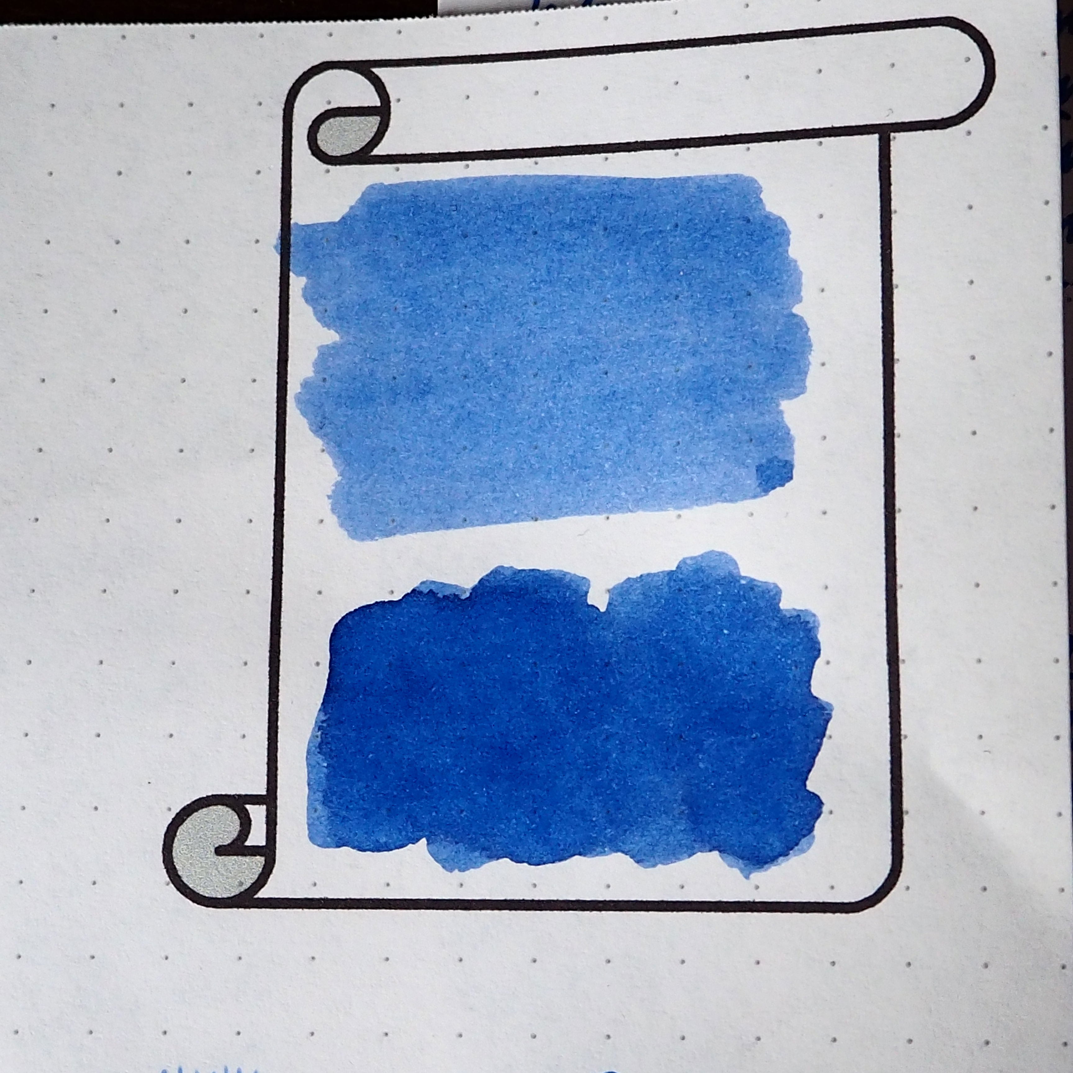 Nie będzie pewnie dla Was zaskoczeniem, kiedy napiszę, że kolor atramentu jest niebieski. ;) Przypomina nieco odcień, który większość z nas kojarzy ze szczenięcych lat spędzonych w szkole, ale jest bardziej nasycony i nie blednie tak po wyschnięciu, dzięki czemu jest wyrazisty. Posiada delikatną tendencję do cieniowania.