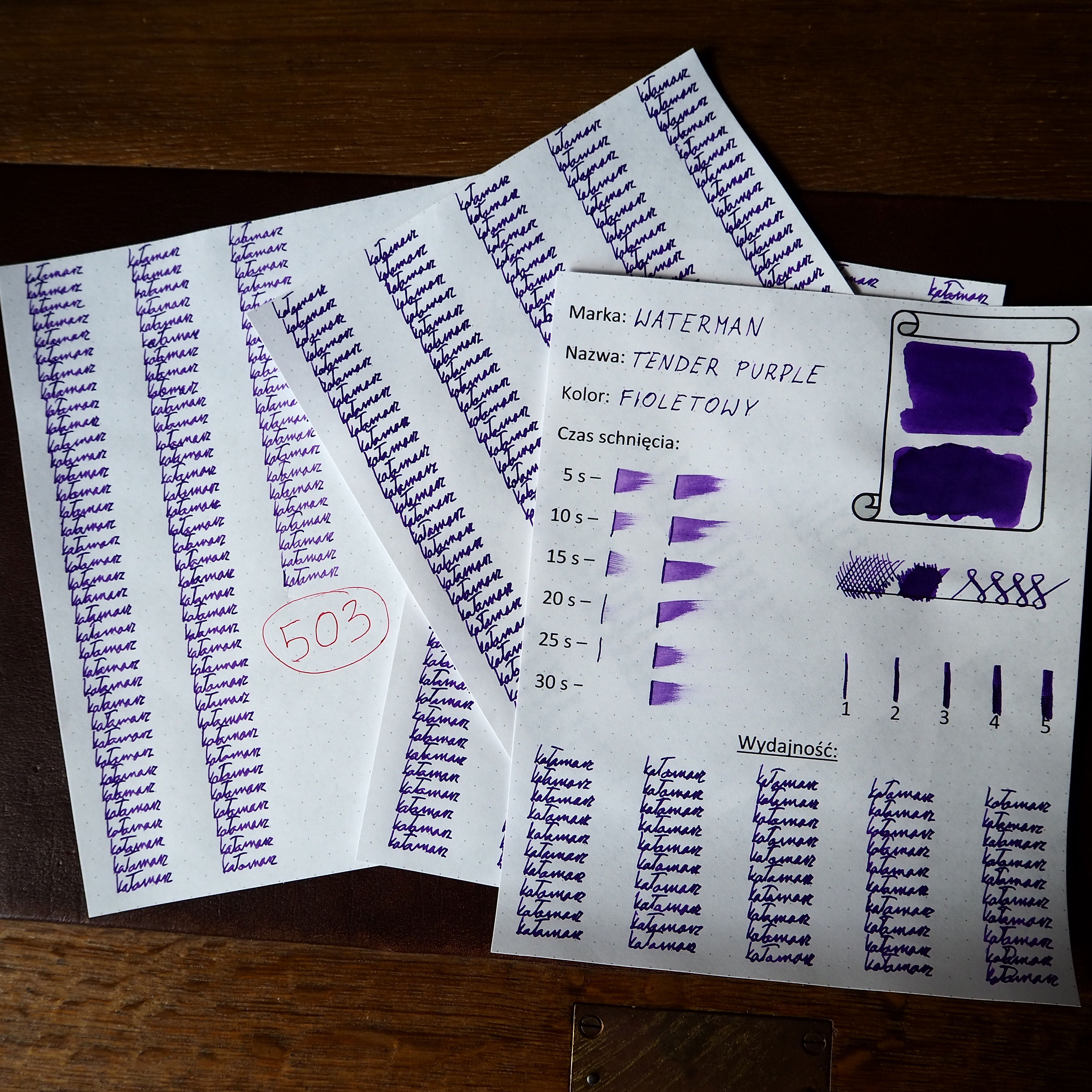 Przepływ atramentu oceniam jako bardzo dobry. Atrament zawarty jedynie w sekcji pióra wystarczył na napisanie 503 "kałamarzy". Otrzymuje za to 1,75 punktu.